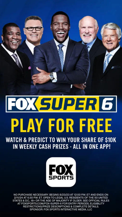 *NO PURCHASE NECESSARY. Begins 8/23/23 at 12:00 p.m. ET and ends on 2/11/24 at 6:30 p.m. ET. Open to legal U.S. residents of the 50 United States & D.C., 18+ or the age of majority if older. See Official Rules at https://www.foxsports.com/fox-super-6 for entry periods, eligibility restrictions/prize descriptions & complete details. Sponsor: FOX Sports Interactive Media, LLC.