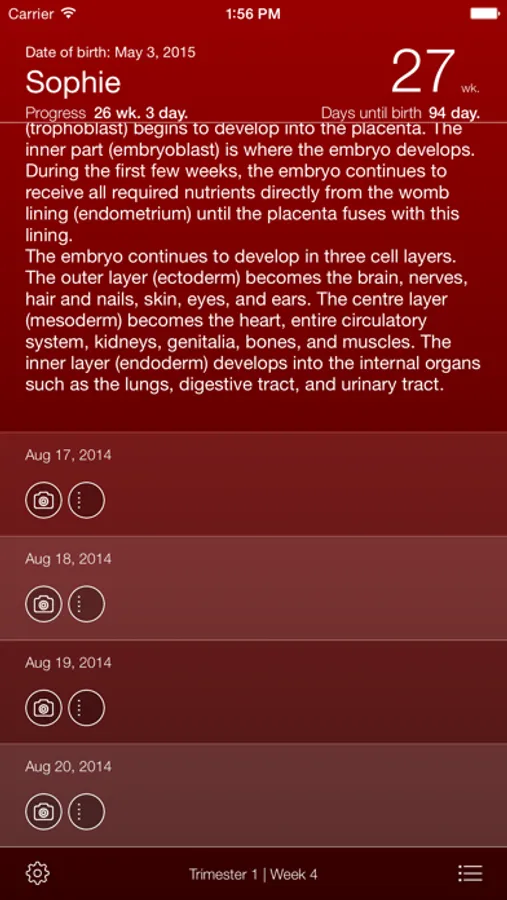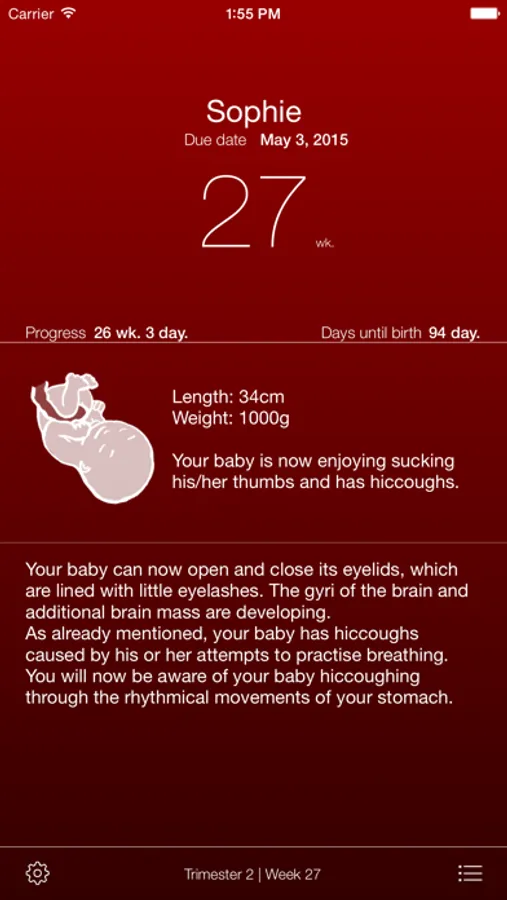 In the detailed view you get every week a brief information and a picture of the development stage of your baby. Whenever you want, you can scroll backwards through the weekly information; however, you can only scroll two weeks into the future.
