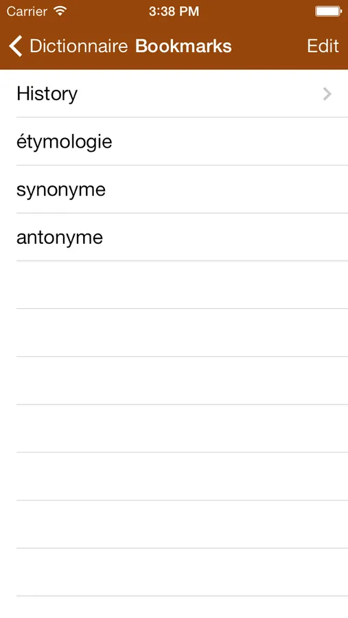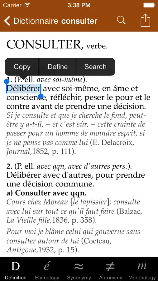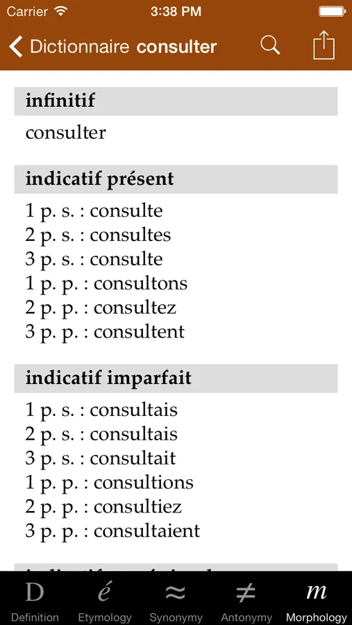 It is possible to view the definition, the etymology, the synonymy or the antonymy of a word.