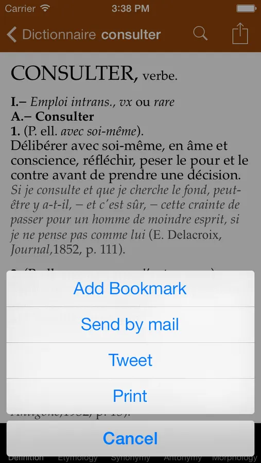 This application for iPhone or iPod Touch makes it easy to consult the online French dictionary TLFi from the “Centre National de Ressources Textuelles et Lexicales” (http://www.cnrtl.fr/).