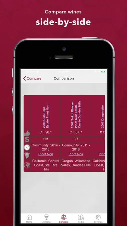 We’re the only app that lets you compare wines side-by-side on the same screen – makes those hard decisions easy when you’re deciding what to buy at the restaurant or wine shop. Compare ratings, prices, drinking windows and more!