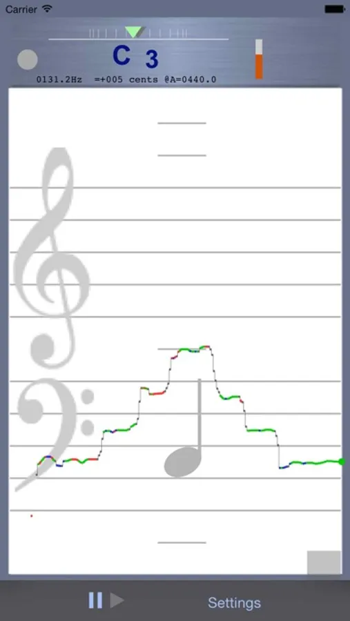 Sing-inTuna uses the built-in microphone on your iPhone or iPad to analyze and help you visualize if you are singing, or playing a musical instrument (such as a violin), precisely on the right pitch. It graphs pitch on a scrolling graph resembling a musical Grand Staff. Tones that are on-pitch (+-20 cents) are colored green; notes slightly sharp: red; notes a pinch flat: blue.