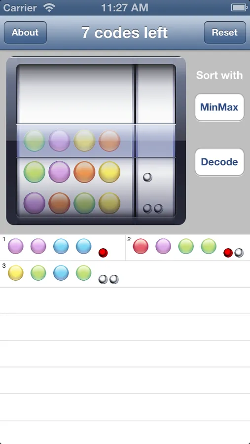 Use the first picker to select a guess. Then select the score you got for that guess on the second picker and click Decode. The application will determine the remaining possible solutions. The number of remaining possible solution is shown on the toolbar. Repeat the above steps until one solution is left.