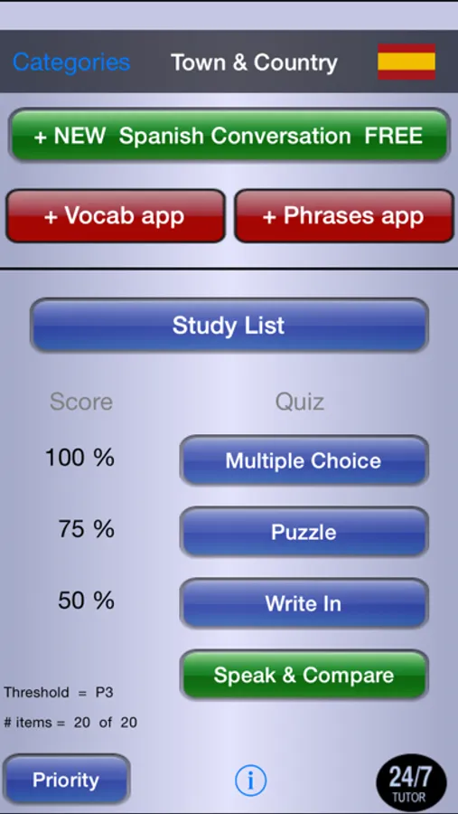 24/7 Spanish goes beyond the simple talking phrasebook or flashcard programs, providing a set of engaging, interactive study tools that help you really learn the language. FREE Spanish lite edition is a fully functional version containing a useful subset of vocabulary and phrases drawn from several of the learning modules in the 24/7 Spanish series.