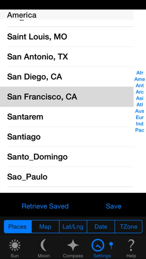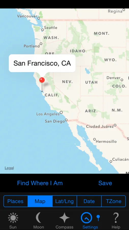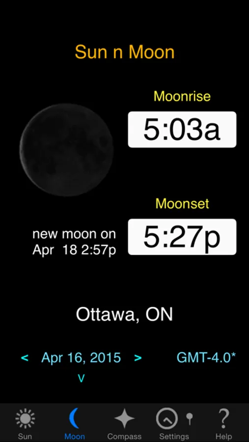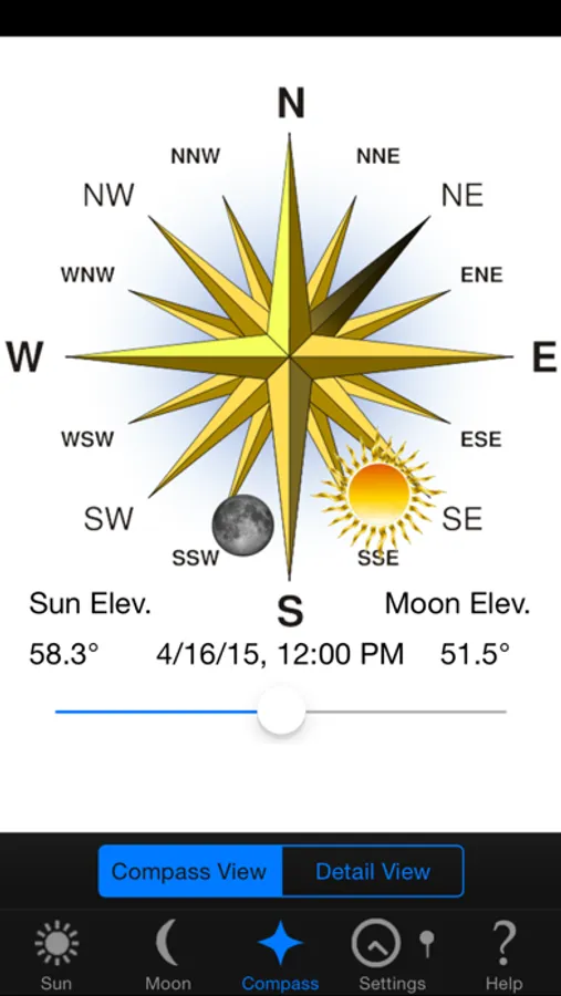 • Compass view for navigation showing position of sun and moon (slider animates the position and elevation for different times of the day)