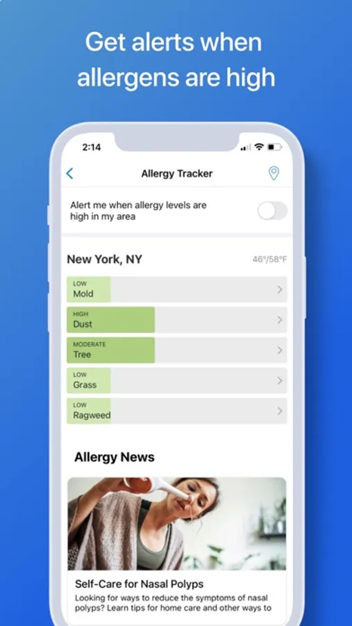 • Allergy Tracker - Get alerts when allergy levels are high in your area. Check allergen levels based on your location.