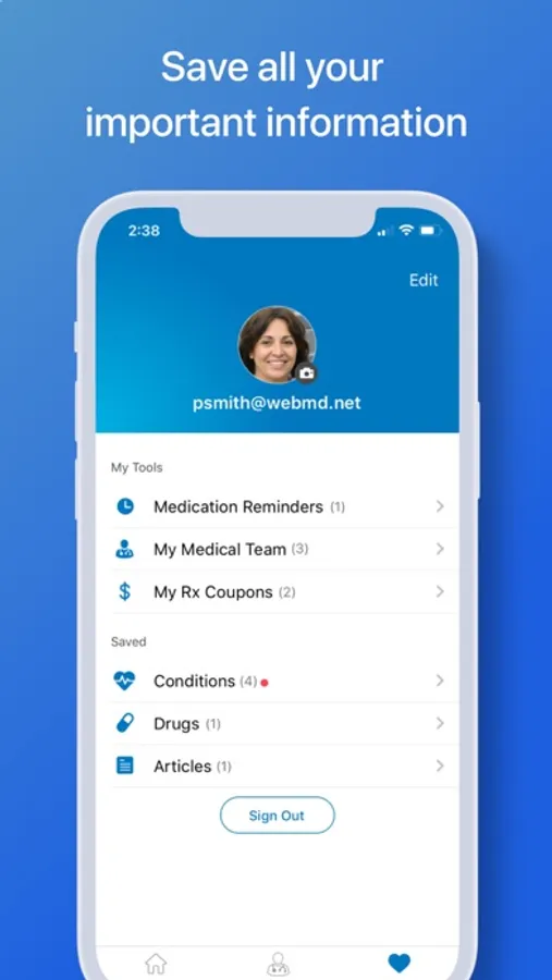 • Customization and Saving Functionality – Save your conditions, drugs, doctors, hospitals, pharmacies, and healthy living articles for secure, easy access and reference.