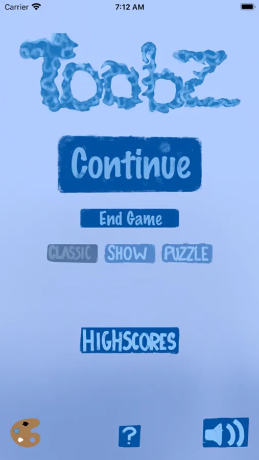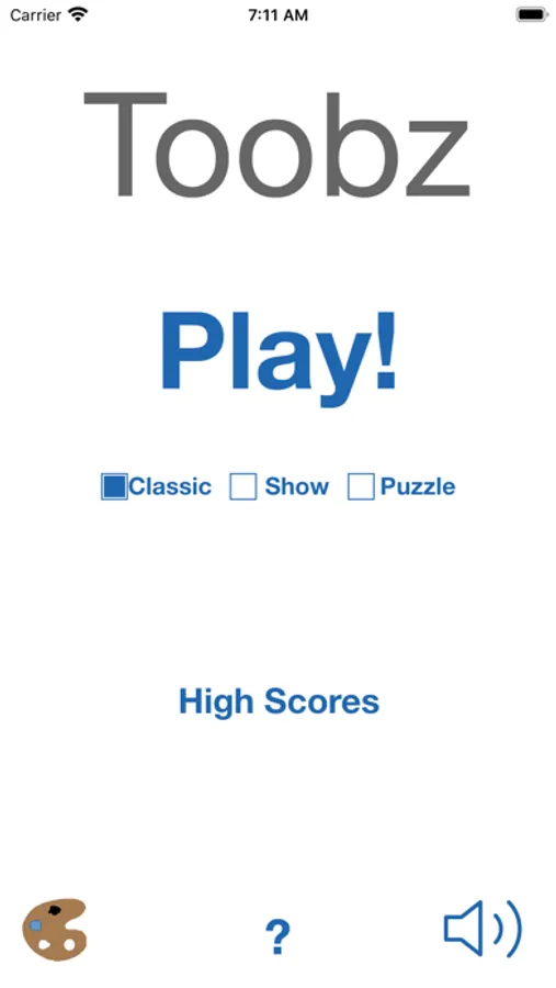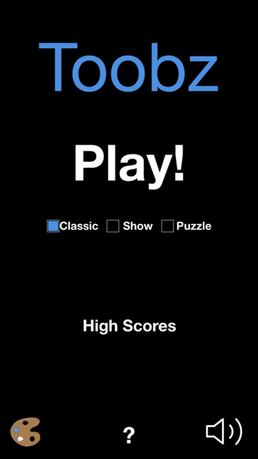 Toobz features three game modes: "Classic Toobz" in which only one upcoming piece is displayed, "Show Toobz" game in which the next four pieces are displayed, and the new "Puzzle" game that starts you out with a full board.