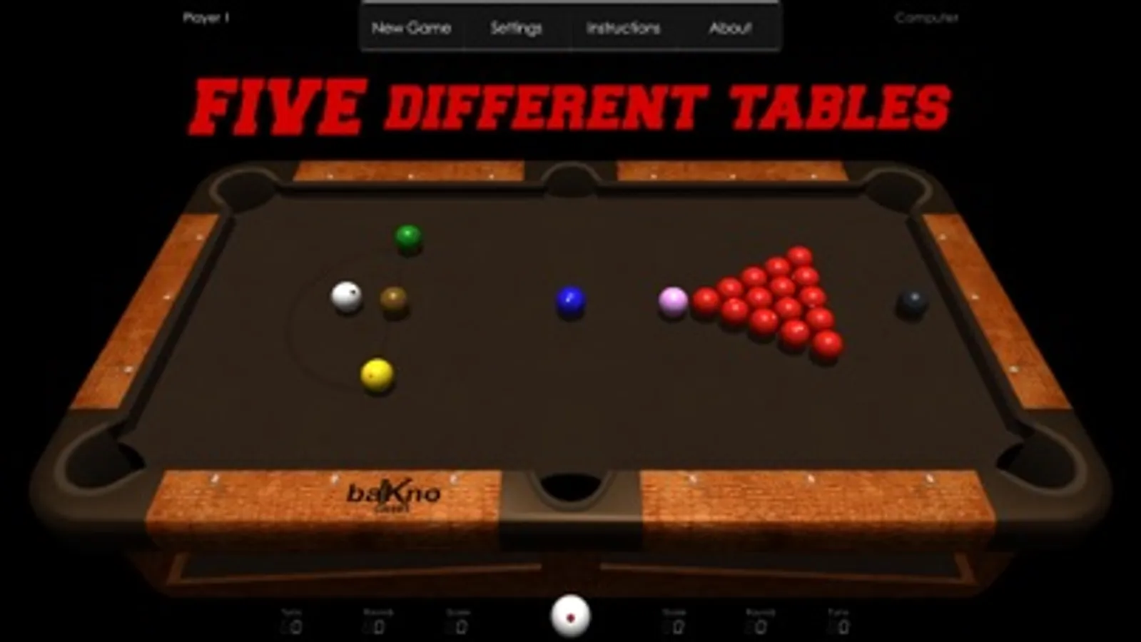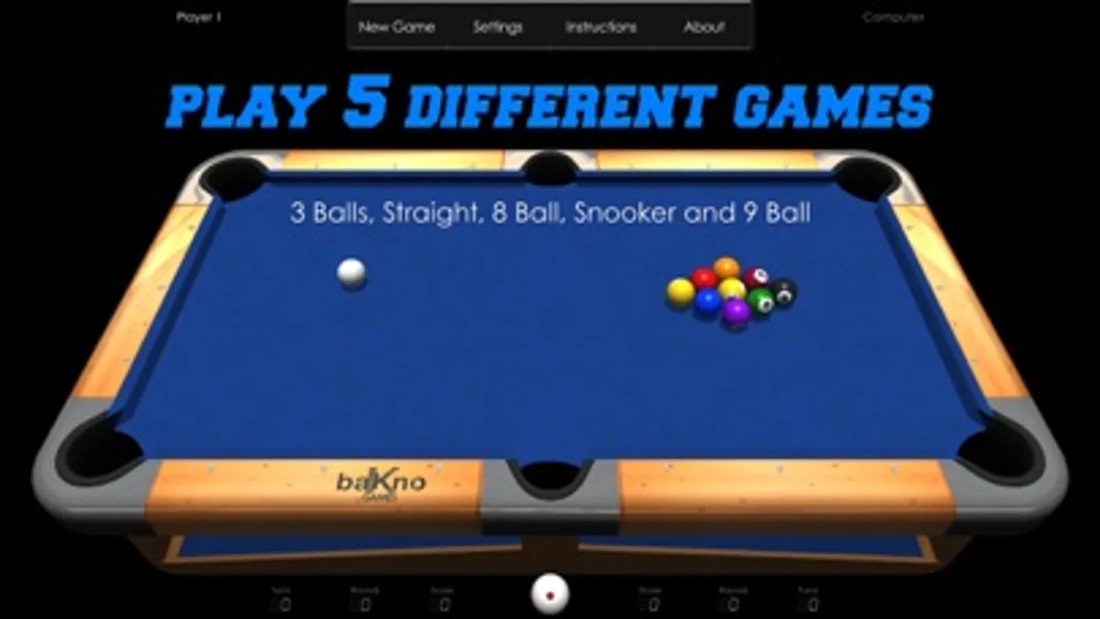 Realistic and very easy to play billiards simulation with five different games. Choose from 9-Ball, 8-Ball, Straight, 3-Balls and Snooker, with customized table and cloth color for each.