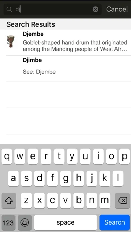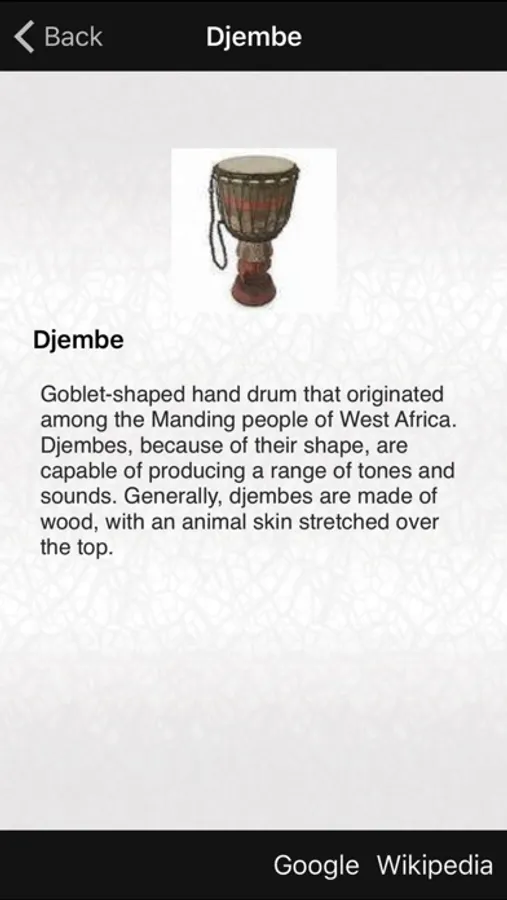 Most often the main description and inline illustration are available directly on the main screen. Tapping an entry displays the details view that often contains additional information regarding a specific term. To widen a definition Almond also features convenient links to Google and Wikipedia which can be accessed through the buttons in the toolbar. These buttons are "pre-loaded" with the current search term and will launch Safari with the results for the search term in either Google Defines or Wikipedia. This three-step access allows quick access to data even if not connected to the internet or when data transfer needs to be kept to a minimum and only takes one additional tap to access the full resources of the internet to do a deep search for a specific musical term.