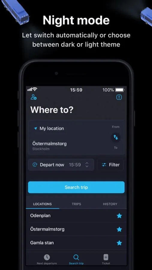 Favorite locations - Save your favorites to speed up future trip searches and view upcoming departures . These are available in the Apple Watch extension as well and enable you to look up departures directly from the Apple Watch.