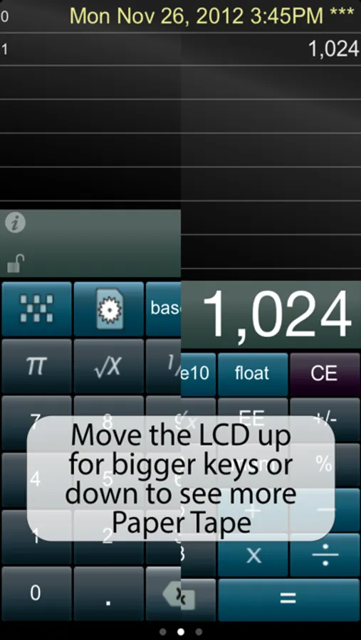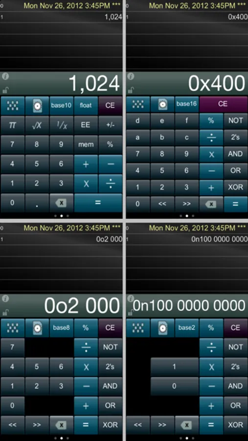 ► Tap the base conversion key to rotate among Decimal, Hex, Octal, & Binary keyboards, or, hold down on the key to select from a menu of the four.