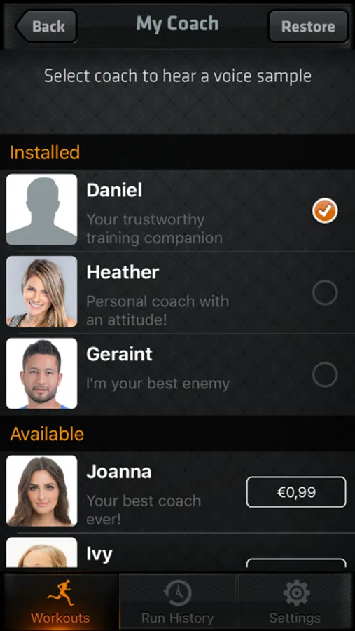 Interval Run guides you with vocal feedback through your interval exercise. Select a workout, tap 'Start' and focus on your exercise, not the watch.