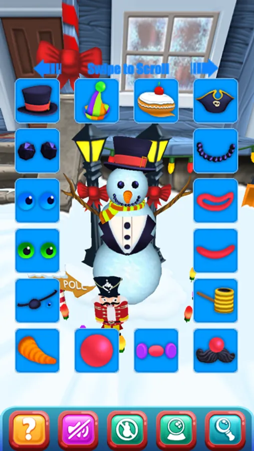 Snowman 3D is a visually pleasing diversion, which allows you to build and decorate your own unique snowman. You can roll a snowball around the backyard, until you reach the size you like. Once three snowballs have been completed and stacked, you can decorate your snowman. There are dozens of different 3D items, which you can attach to your snowman. When you are satisfied with your creation, you can take a snapshot of your work, save it in your photo album, then send it to your friends. Use swipe to move the snowball; pinch and swipe to control the camera, taps and swipes to navigate through pages of decorations.