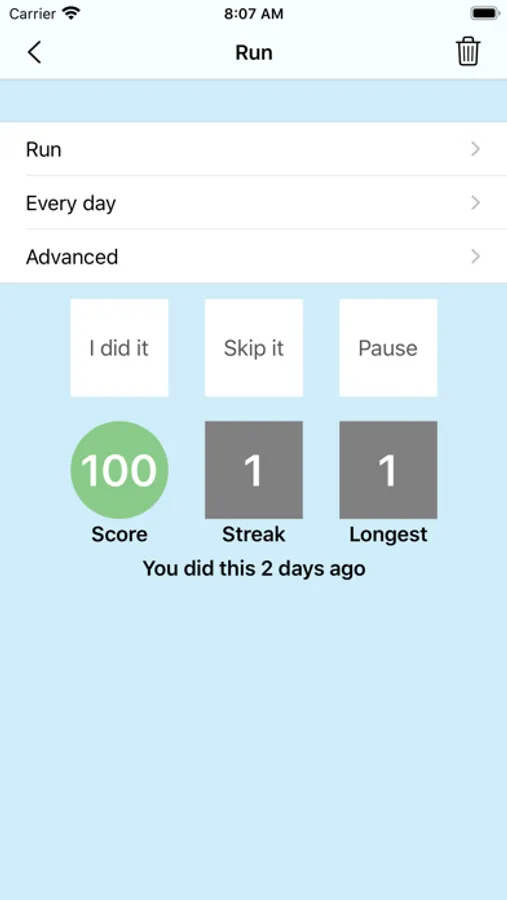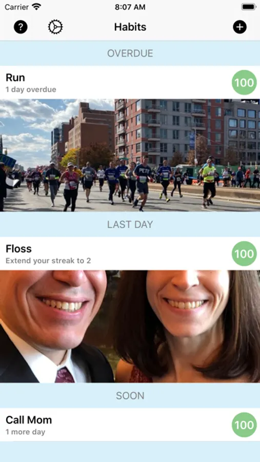 Habits is the only app that lets you see the full history of all of your habits in an easy to use way. The Habit score represents your full history in a 0-100 score with your current activity counting more than your past. Doing your habit on time and more often increases your score.