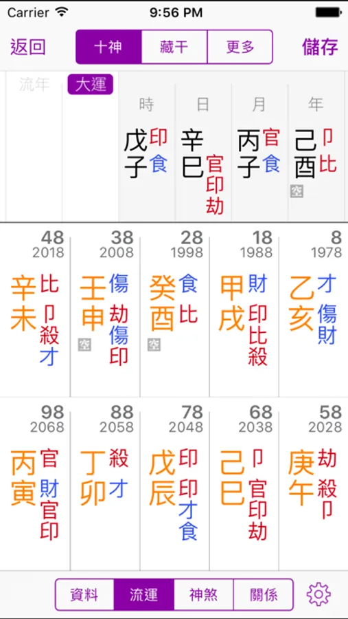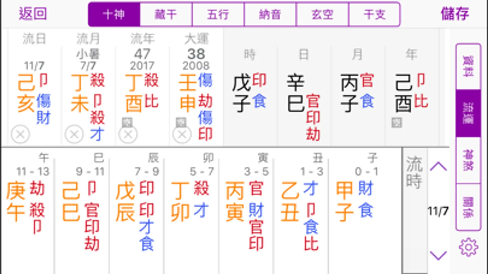 ‧ 可隨時轉換顯示「十神」、「藏干」、「五行」、「納音五行」或「玄空大卦」。
