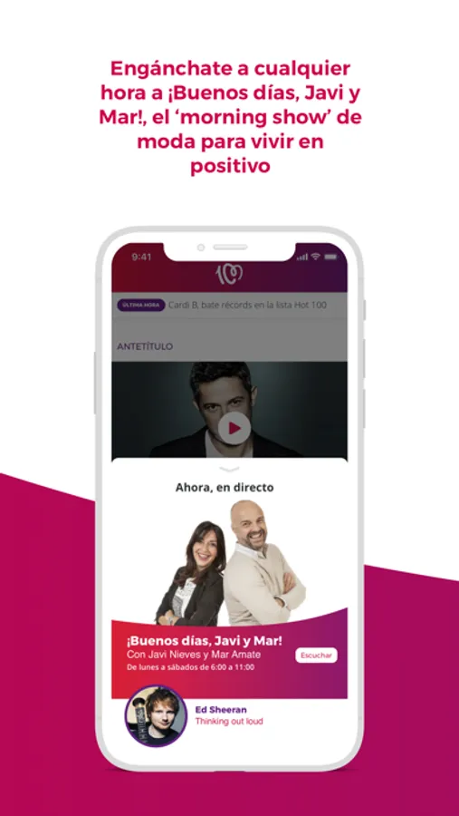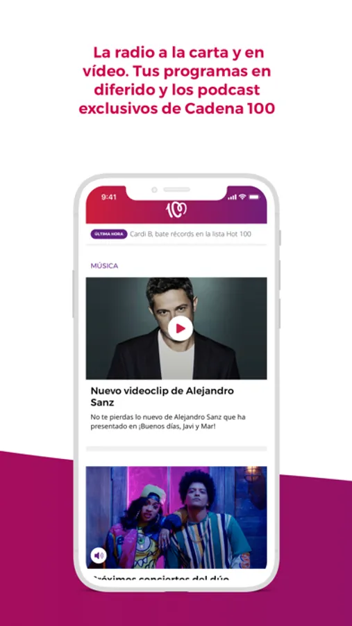 Escucha La mejor variedad musical en la app de CADENA 100 y disfruta de 45 minutos de música sin interrupción cada hora. Música en cualquier momento del día, acompañada de toda la información sobre tus artistas favoritos, consejos y propuestas para que no se te agoten nunca ni el optimismo ni los alicientes para ver siempre el vaso medio lleno. La radio, más interactiva y participativa que nunca, con la nueva aplicación de CADENA 100.