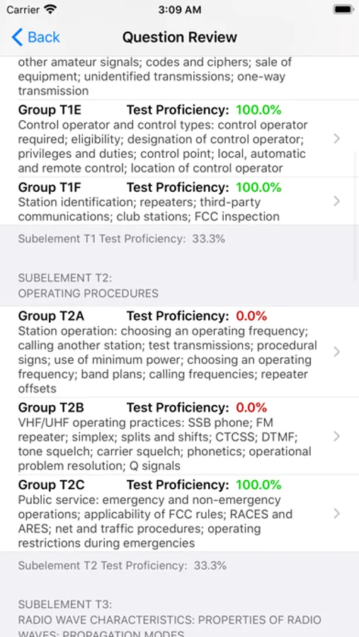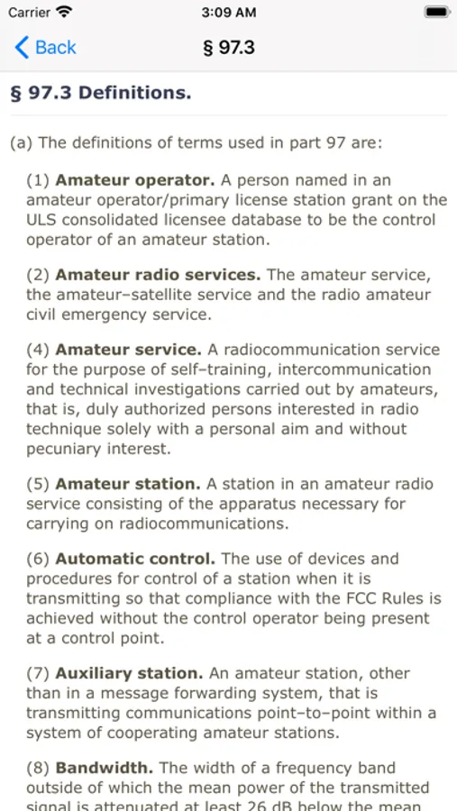 FCC rule text is viewable within the application. All sections can be browsed from the main screen. Additionally, for questions where rule sections have been identified, the rule text can be viewed on the question screen when studying the question pool or reviewing test results.