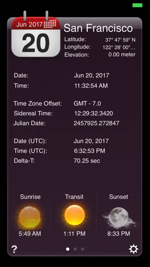 - the main one gives you information such as: Julian Date, Sidereal Time, Delta-T, Sunrise, Transit and Sunset;