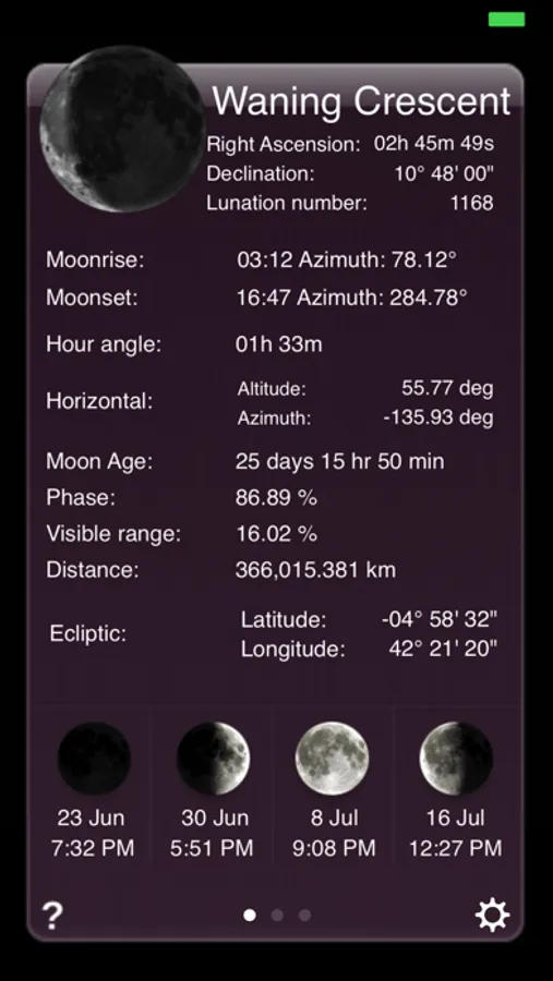 - the second page gives you all information you need on the Moon; actual phase, right ascension and declination, lunation, next phases, horizontal coordinates, moonrise, moonset, and more;