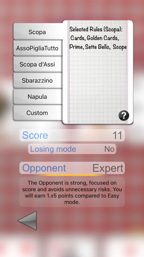 - full custom and optional rules covering almost all the scopa variations: scope, cards, golden cards, sette-bello, re-bello, prime, napula, berola, maratona, napoleone, asso piglia tutto, scopa d'assi, sbarazzino, declarations (cucite/accuse)