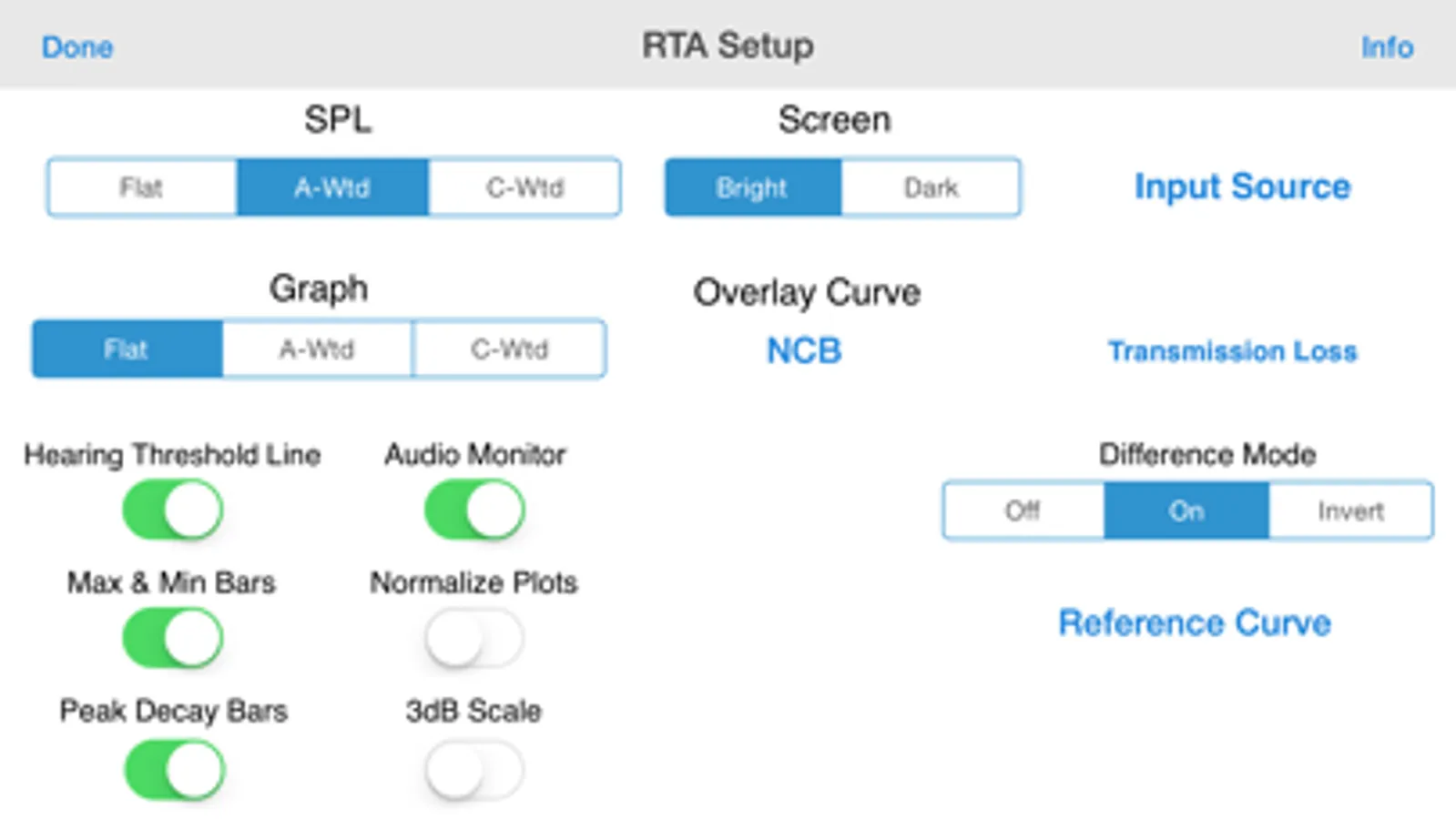 Also included are optional noise curve overlays, in NCB, RC, PNC, NC, X-Curve and NR mode. See picture #2 for an example. Use this feature to get a quick reading on the noise levels in a room. Also includes the cinema large-room X-curve overlay.