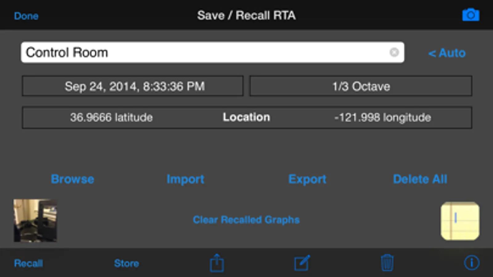 You can save and recall graphs, marked with the GPS location, date & time, and your comment, as well as store the image to your photo roll.