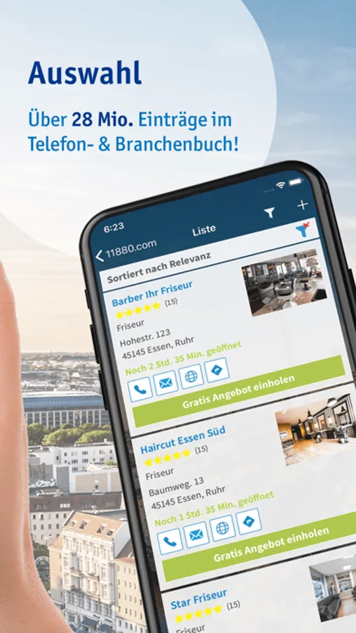 Mit 11880.com haben Sie Ihre Stadt in der Hand. Hier finden Sie alle Adressen, Telefonnummern und Informationen aus Ihrer Region. Wo gibt es das beste Restaurant in der Nähe? Was läuft heute Abend im Kino? Welche Apotheke in der Umgebung hat noch offen und welcher Friseur verpasst mir heute den modernsten Haarschnitt zum Sonderpreis? Wo ist der nächste Geldautomat? Und damit Sie auch unterwegs nicht verloren gehen, navigiert Sie die 11880.com App sicher zu jedem Ziel.
