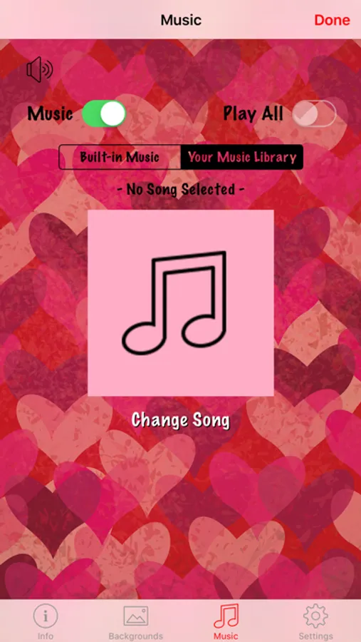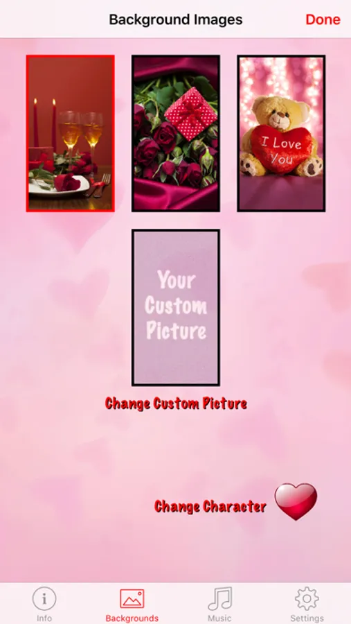 While listening to music (built-in or your own), see the number of days countdown until Valentine's Day. Watch the animated characters get bigger as Valentine's Day gets closer displayed on the included background images or use your own picture.