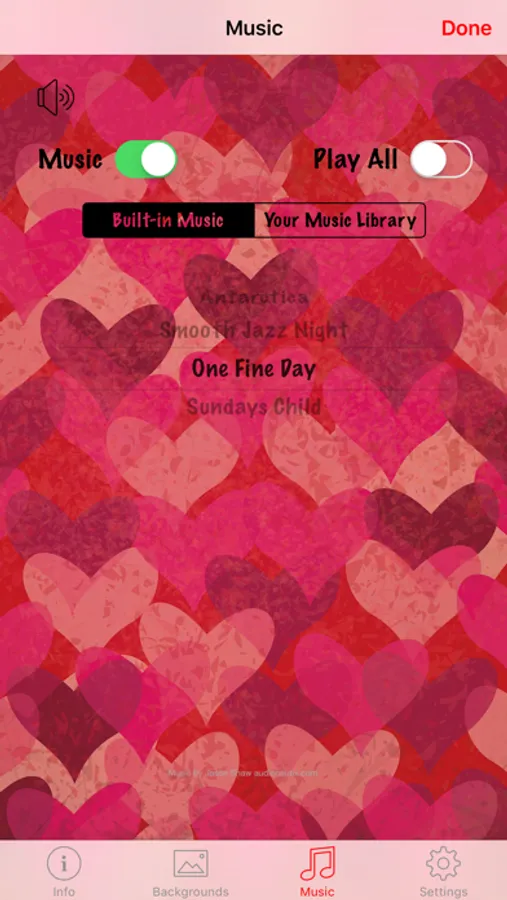 • Select one of 4 background musical soundtracks. Select one or automatically play all the songs in a repeating sequence. Select Airplay to play the music to your Apple TV.