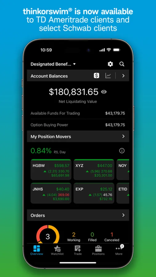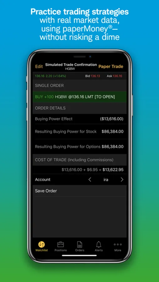 Now, whether you trade with Schwab or TD Ameritrade, you won’t miss a minute of the market. Put the power of thinkorswim® right in your pocket with our trading app. Manage your positions; find quotes, charts, and studies; get support; and place trades easily and securely—all right from your phone or tablet. Access investment products like stocks, options, futures, and forex, and even try out new strategies with our paper trading feature, paperMoney®.