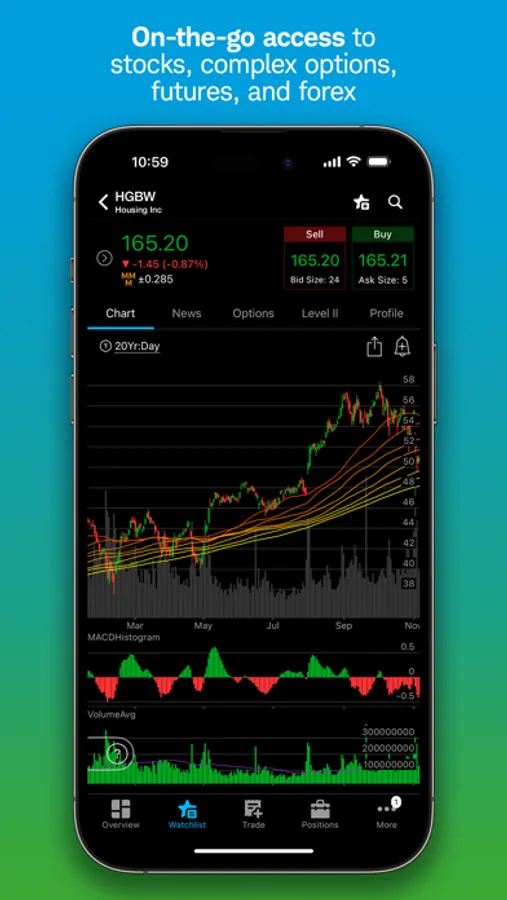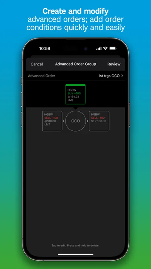 • Trade stocks, complex options, futures, and forex. Create and modify advanced orders and add order conditions quickly and easily.