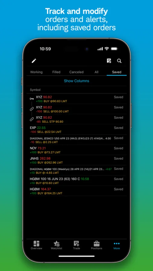 • Track and modify your watchlists, orders, and alerts, including saved orders.