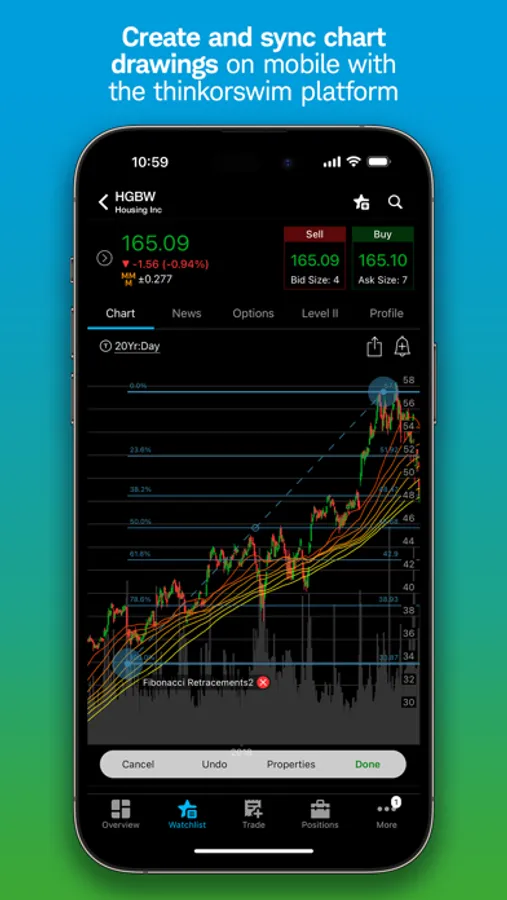 • Scan multi-touch charts with hundreds of studies. Chart drawings will sync with the thinkorswim platform. Glance at the past, take a look at the present, and model the future when you overlay company and economic events.