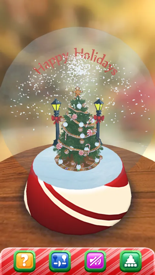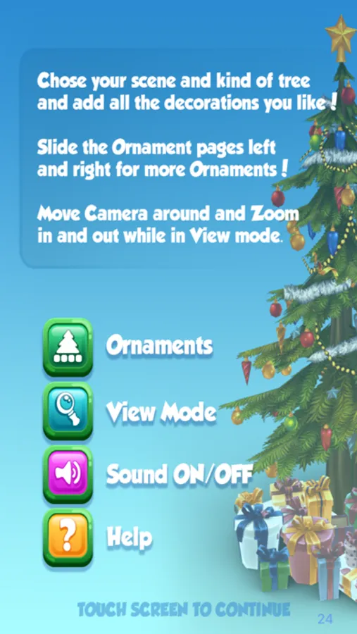Use swipes to navigate through pages of ornaments and lights, and taps to place them on and off. Dimmer can be used to turn down the lighting in the room to enjoy the animated lights!