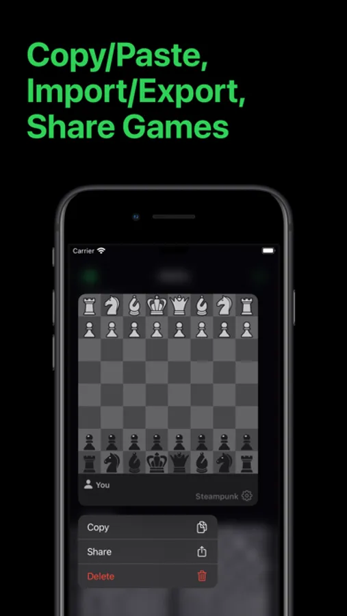 - OPEN GAME FORMAT: Games can be shared, saved, copied, pasted, imported, exported in the ubiquitous, open source PGN format.