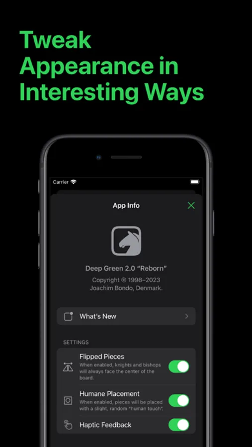 - UNIQUE CHESS ENGINE: Enjoyable opponent with adjustable strength, praised for its humane gameplay, developed for Deep Green on the Apple Newton more than 25 years ago.