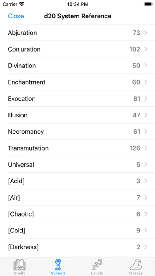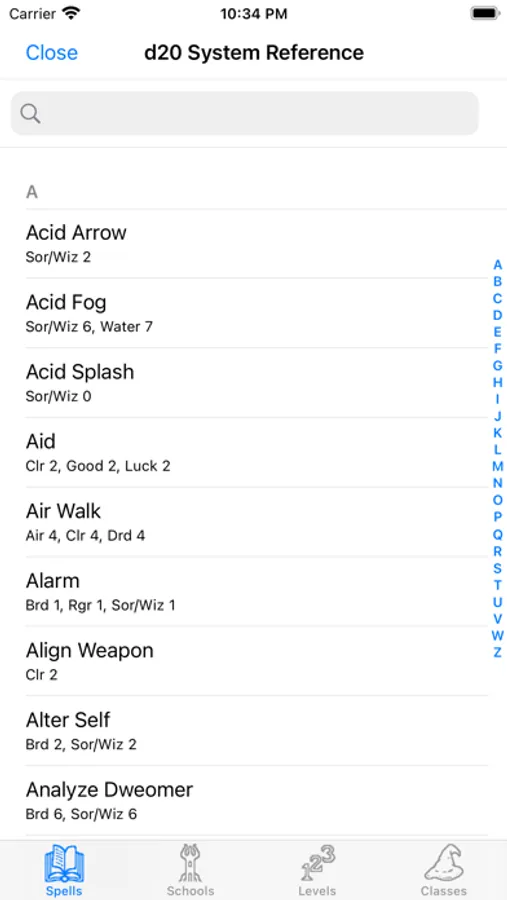 You can browse spells by name, level, domain and class. For each class, see spells sorted by name or by level for easy access. Searching allows you to find spells by any search term.