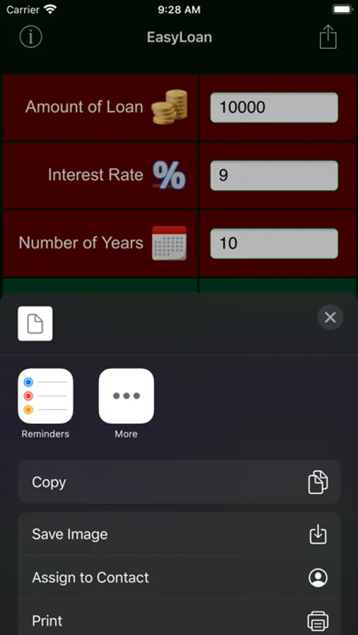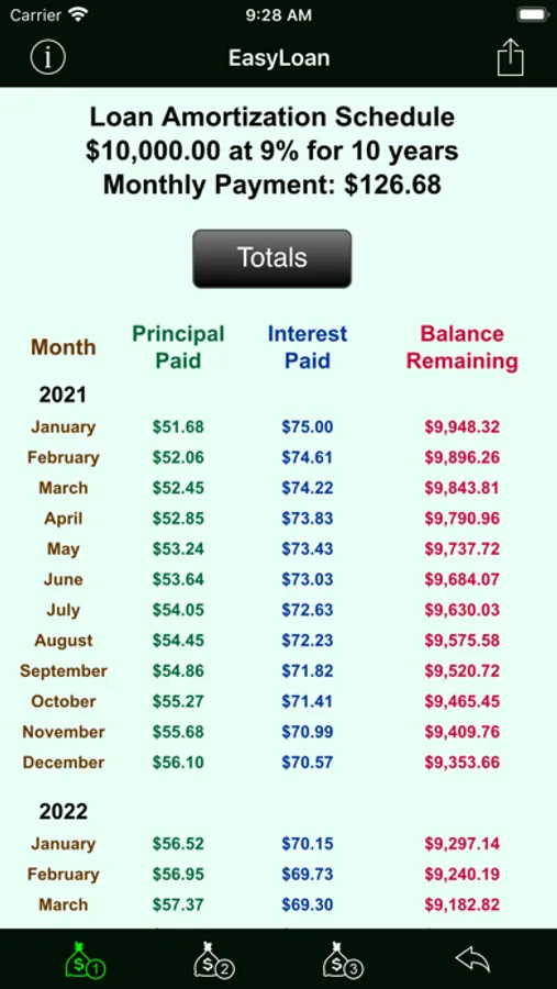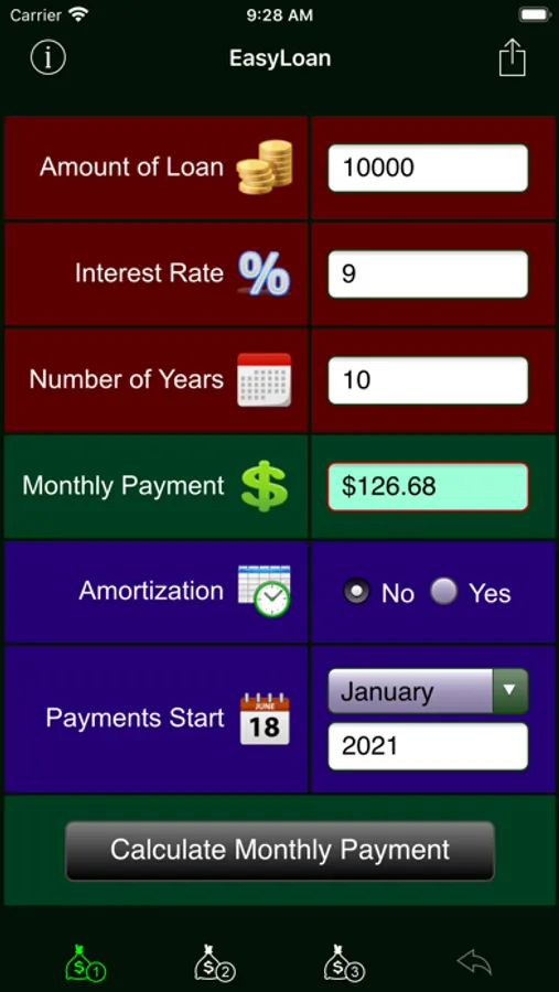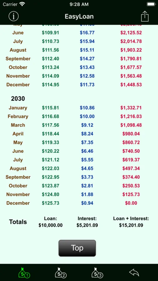 The original iPhone loan calculator is back! EasyLoan is an app that will let you quickly calculate loan payments for up to 3 different loan scenarios. Simply enter the loan amount, interest rate and term. Then press the "Calculate" button and the loan payment is computed. There is also an option to display and email an full amortization table.