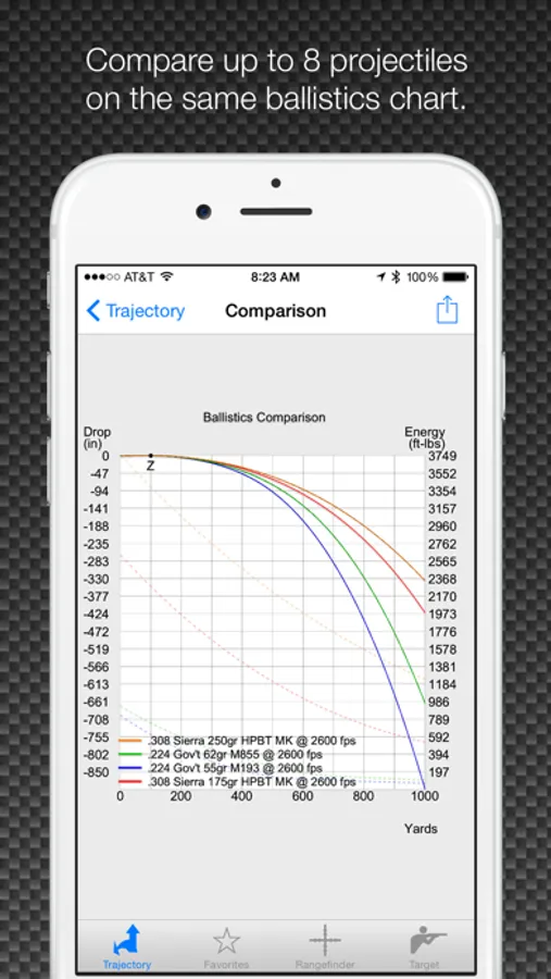 - Ballistic Charts: Display a chart of the current projectile including drop, energy, and velocity. Compare wind drift. Compare up to eight projectiles on the same chart. Trajectory charts display the projectile's path across multiple altitudes and angles. Zoom charts up to 300% or save a full size chart to your photo album.