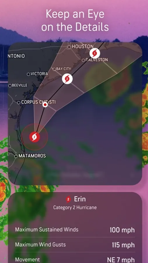 - Weather radar views for water vapor, rainfall, sustained winds, and even storm surges