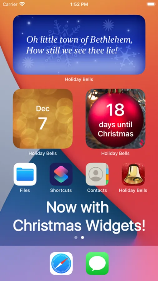 Widgets: New in iOS14, add festive holiday widgets to your home screen! Holiday Bells has small, medium and large size widgets. Widgets can display the date, the days until Christmas, or holiday song lyrics, and there are several seasonal backgrounds to choose from.