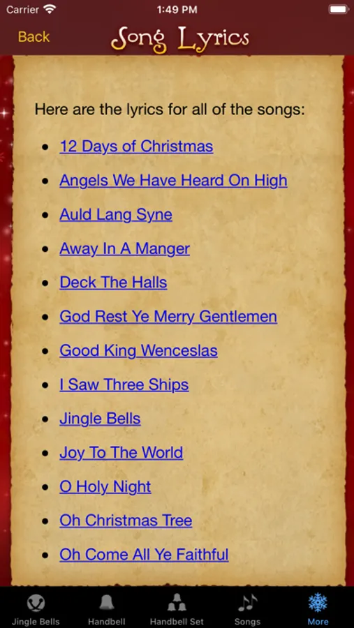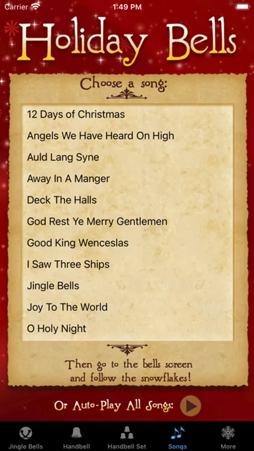 Songs: 20 Christmas songs, with favorites like "Jingle Bells", "Away in a Manger", "Joy to the World", and more. Scroll the songs list to see them all. Choose a song, then follow the snowflakes to tap along, or press the Auto-Play button to have the app play the song for you!
