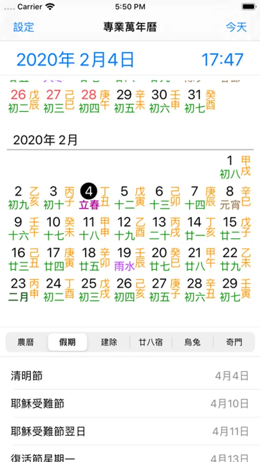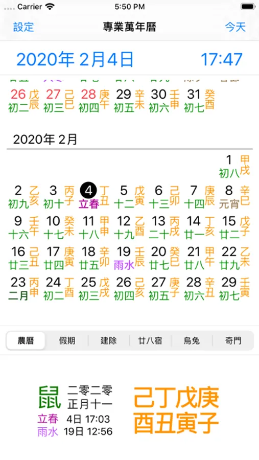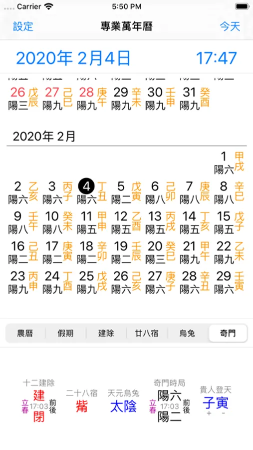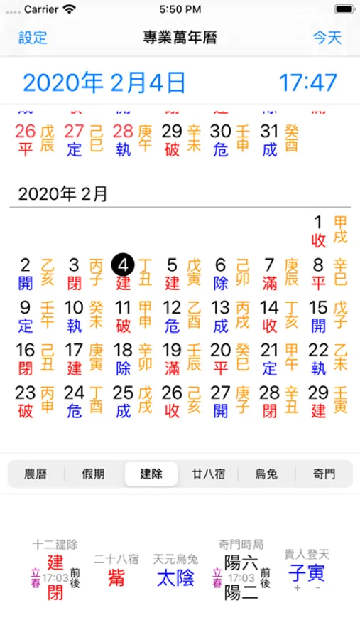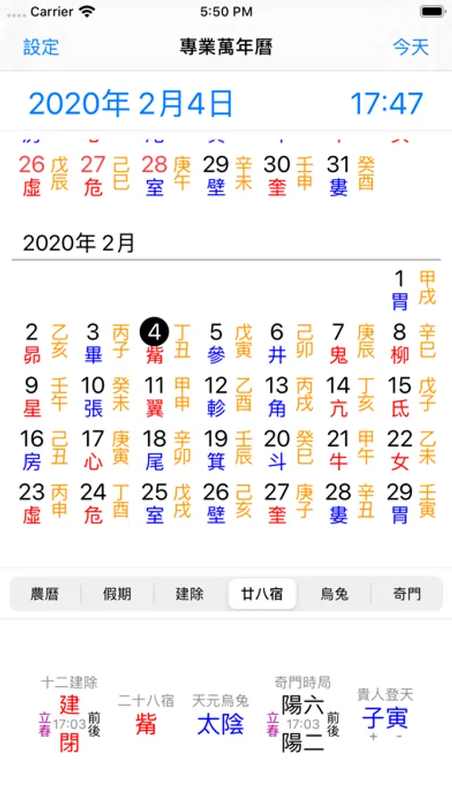 按下 十二建除、二十八宿、烏兔太陽、奇門時局 或 農曆 可切換成整月顯示模式