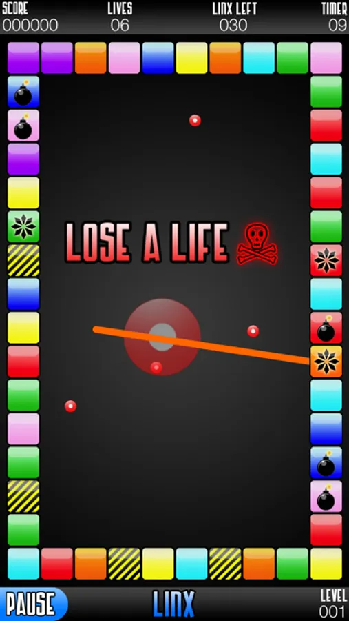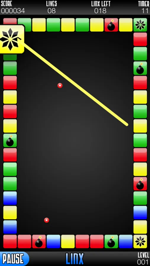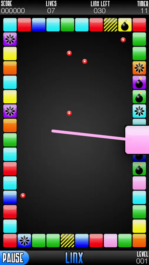 It's not as simple as you think though. In your way are balls that bounce around the screen. Hit a ball with your line while you're drawing it and you lose a life. Take too long to draw a link, and you lose another life. There are also certain combinations of linx that make your line wider for a short time making it harder to avoid the balls.