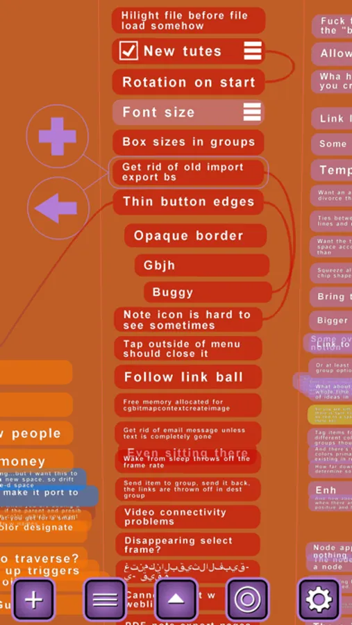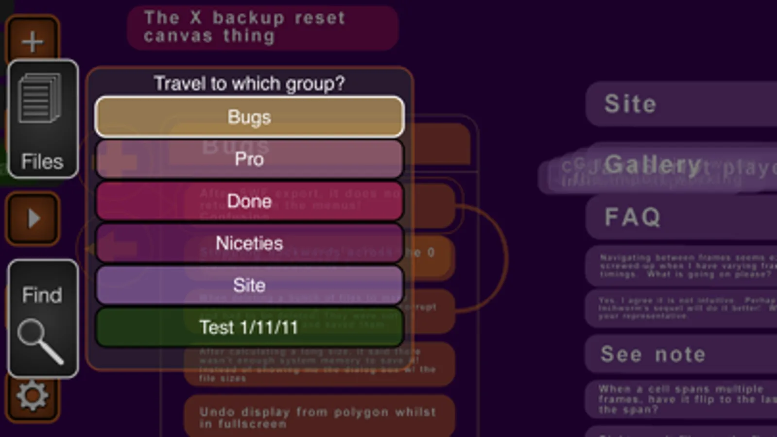 Headspace allows you to create items and groups of items on a floating plane in three-dimensional space. The hierarchy of items and their various sub-items make for a beautiful display of information as they recede into the distance. Simple and familiar finger gestures allow you to move around the space. Use the menu button to travel between various groups. Easily create links and travel between them.