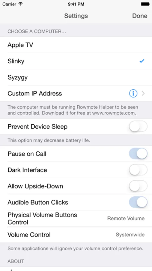 • Mac: The free Rowmote Helper program must be running on the Mac to be controlled. Download at www.rowmote.com. Some features require later versions of Mac OS X.