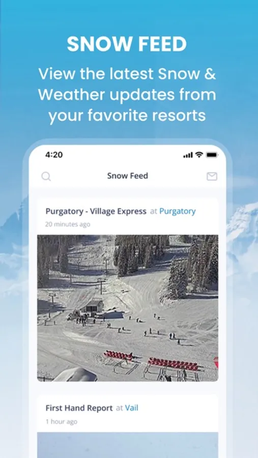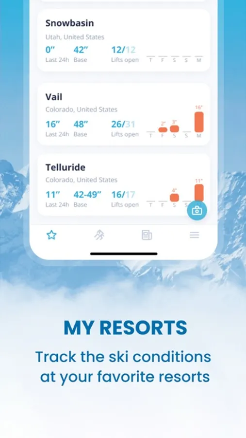 -- Snow Near Me: The My Resorts screen stores, tracks and compares all your favorite ski resorts so you can find out where it is snowing right now, what the conditions are like at your local mountain and get a glimpse of recent snowfall there.
