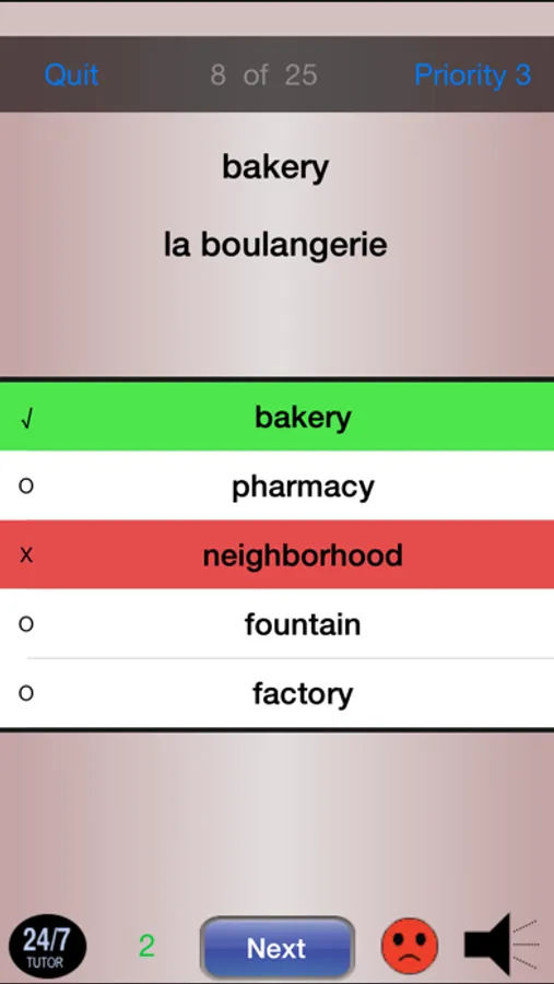 24/7 French Vocabulary has basic language vocabulary in the categories of Family, Friends, Travel, Home, Office, School, Countryside, Around Town, Money, Food, Drink, Clothing, Weather, Time, Date, Pronouns, Thoughts, Adjectives, Opposites, Colors, Descriptive Words, Numbers and more.