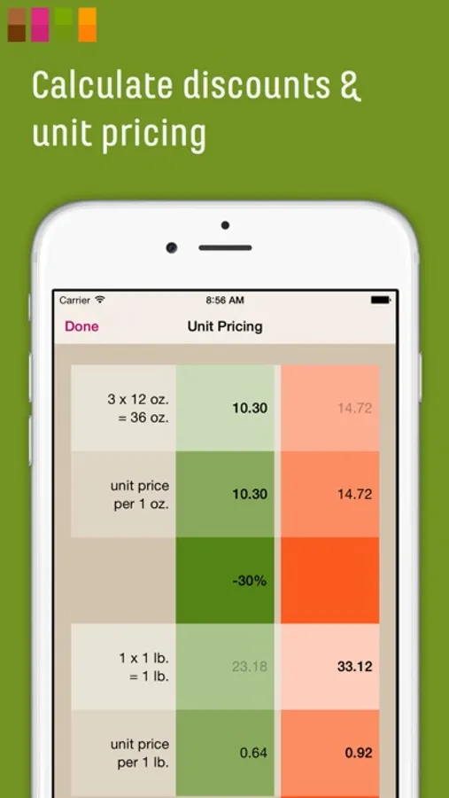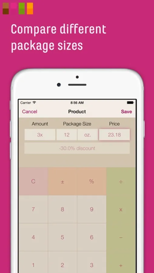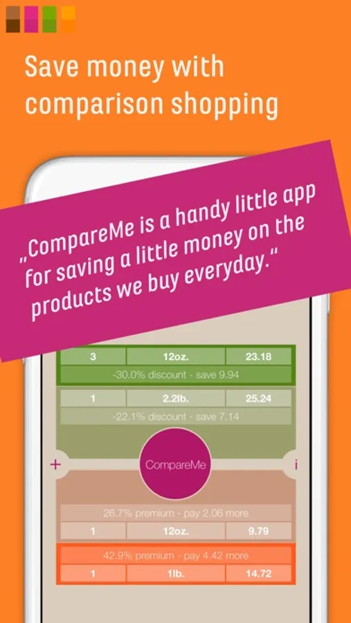 CompareMe helps you to save money by comparison shopping. Compare products in different sizes in different packs. The comparison calculator shows the percentage discount and premium directly. You even get the info how much you’ll save or pay more in cash. You now even get the unit prices of the two products you compare on the detail screen.